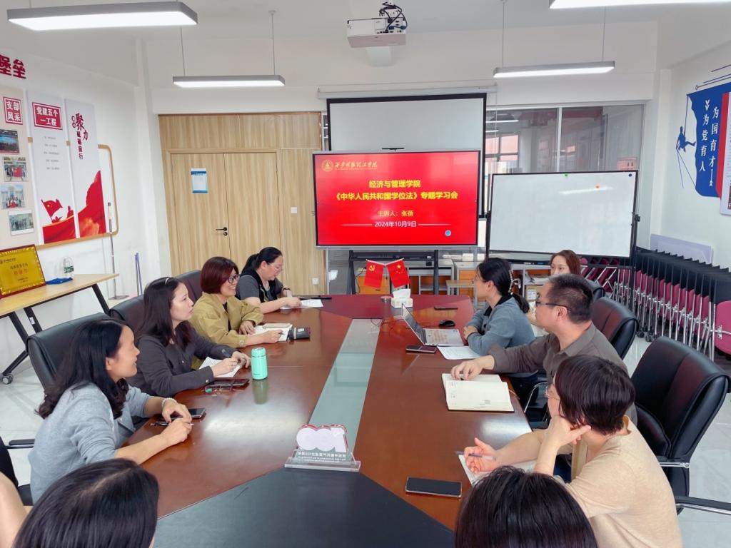 2024年4月26日,第十四届全国人民代表大会常务委员会第九次会议表决通过《中华人民共和国学位法》(以下简称“《学位法》”),自2025年1月1日起施行。为学习贯彻学位法的精神与规定,探讨学位法的实施,提升高等教育学位管理水平,10月9日,经济与管理学院组织召开专题会议学习《学位法》,学院教学副院长许萍、办公室主任张蓓、各专业负责人及学院办公室人员参会。会议由许萍主持。